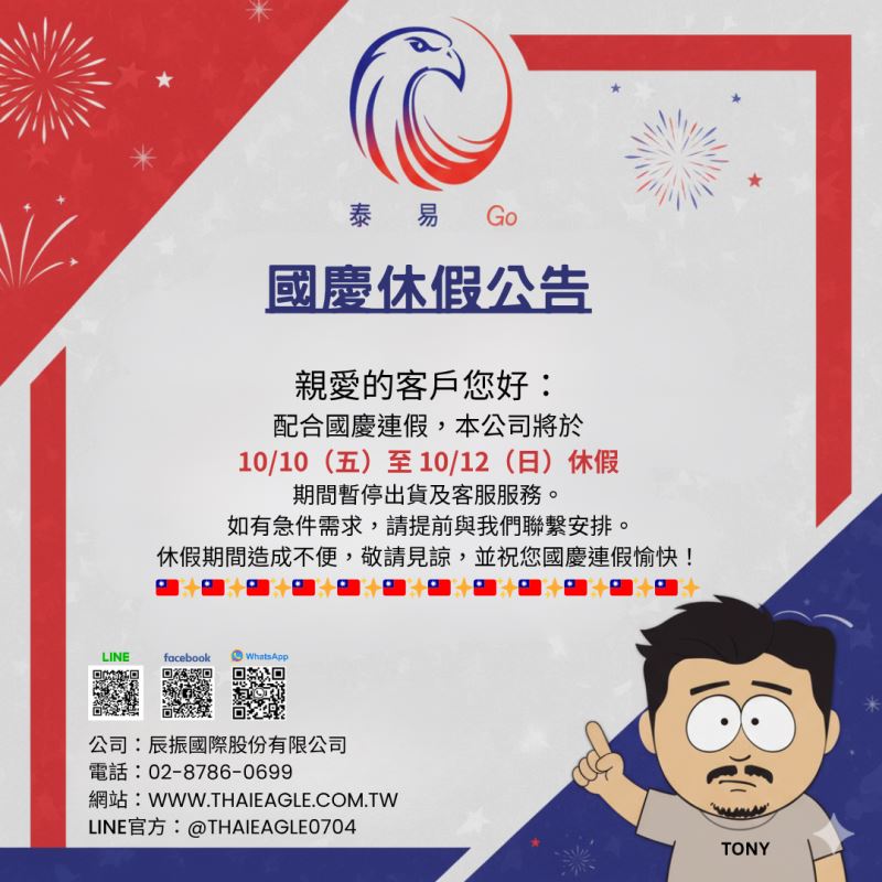 🇹🇼🎉 泰易Go|雙十國慶休假通知 & 優惠航線 🎉🇹🇼 親愛的客戶您好: 配合 雙十國慶連假,本公司將於 10/10(五)至 10/12(日)休假,期間暫停出貨與客服服務。 如有急件需求,請提前與我們聯繫安排。 ✨ 雙十優惠航線 ✨ 🚀 馬來西亞 ➝ 台灣 包稅空運快遞 大降價 → NT$160/kg 起 🚢 台灣 ➝ 泰國 包稅海運快遞 一個月四班船 → NT$115/kg 起 📦 其他航線服務: ✈️ 台灣 ➝ 泰國 包稅直飛空快|1-3天到貨 ✈️ 台灣 ➝ 泰國 包稅轉運空快|10-12天到貨 🚢 台灣 ➝ 馬來西亞 包稅海運快遞 🔥 #雙十國慶 #國慶連假 #泰易Go #跨境物流 #台灣泰國 #馬來西亞台灣 #包稅快遞 #免關稅 #空運 #海運